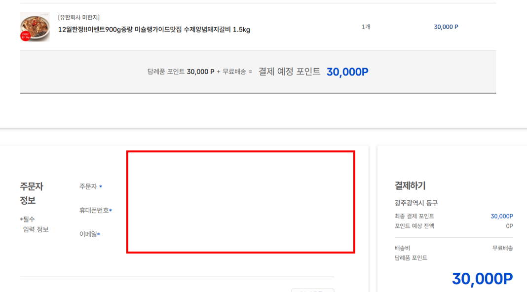다시 답례품으로 돌아와 바로선택을 누르면 위와 같이 답례품 주문으로 들어가 받은 포인트로 결제를 진행합니다.