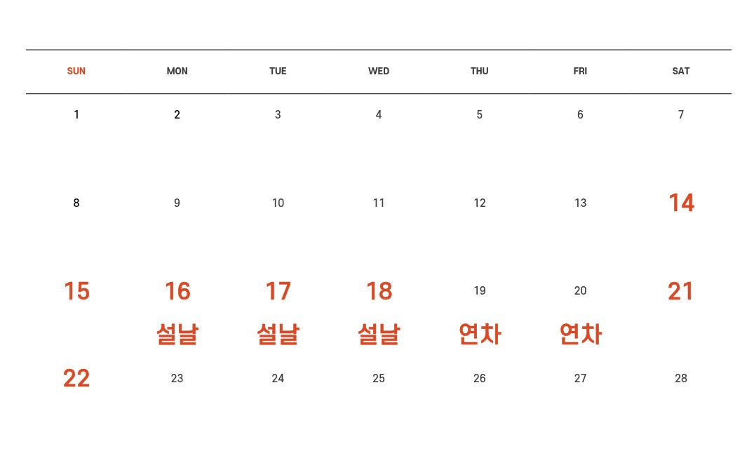 | 설날 연휴 | 2월 16일~18일 (3일) | 월~수 | 5일 연휴 | 9일 |